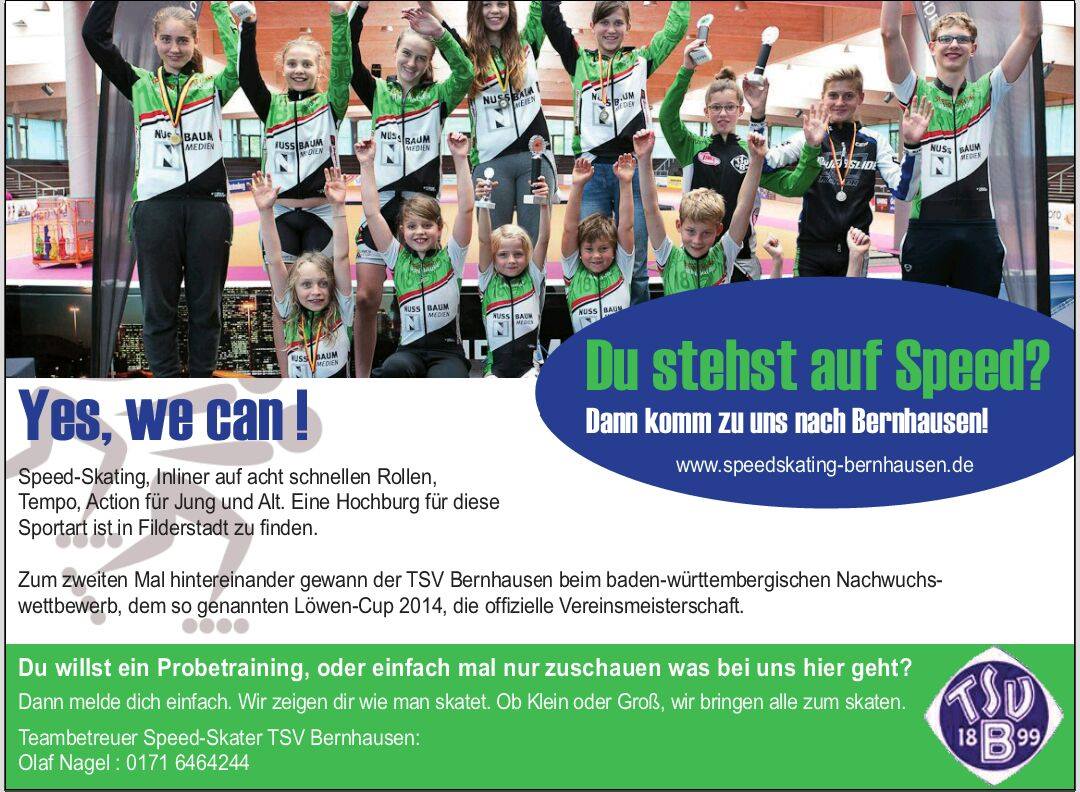 Speed-Skating, Inliner auf acht schnellen Rollen, Tempo, Action für Jung und Alt. Eine Hochburg für diese Sportart ist in Filderstadt zu finden. Zum zweiten Mal hintereinander gewann der TSV Bernhausen beim baden-württembergischen Nachwuchswettbewerb, dem so genannten Löwen-Cup 2014, die offizielle Vereinsmeisterschaft.