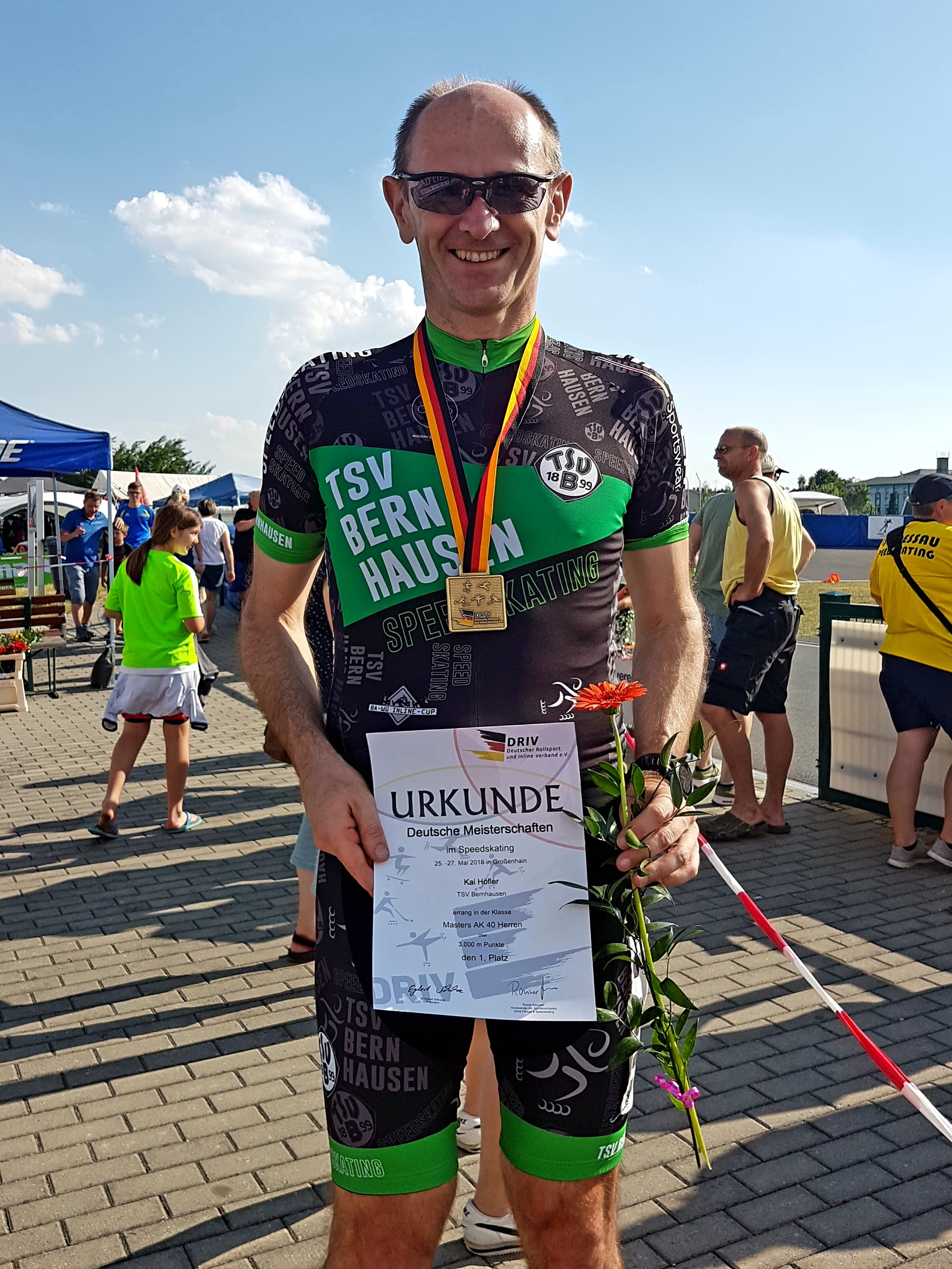 Kai Höfler konnte sich nach zwei vierten Plätzen über 500m und 1000m im 3000m Punkterennen durchsetzen und erreichte ersten Platz. Damit konnte er sich seinen ersten Deutschen Meister Titel sichern.